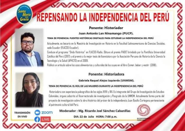 https://www.facebook.com/ColegioSantaMariadelaGraciaJM/videos/2621739824795531 Agradezco a Ricardo Sanchez Cabanillas por la invitación para presentar algunas fuentes que usamos los historiadores para estudiar la independencia. Estoy muy contento porque mañana podré compartir con estudiantes de colegio; además, cuando pensaba seguir la carrera Historia tenía en mente ser maestro de escuela.